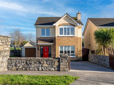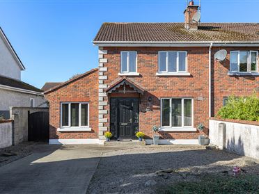 Entrance: With tiled flooring, stairs to first floor with carpet. Alarm panel Sitting room: To the front of the property with bay window, wooden flooring and coving. Open plan kitchen/dining/living room: Kitchen— with an extensive range of wall and floor units with tiled splashback, integrated appliances, complemented by tiled flooring . A double aspect gives ample natural Light. Double door provides access out to the rear patio. Dining area: with wooden flooring, recessed lighting and solid fuel stove, tv point. Living area: leading on from dining space, with wooden flooring and double doors lead outside. Guest wc: Conveniently located off the hallway, with tiled flooring, whb & wc Landing: With carpet flooring and hot press. Master bedroom: A generous double room with carpet flooring , built in wardrobes and overlooks the front of the property. Bedroom 2: A double room with wooden flooring and tv point. Positioned at the rear of property. Bedroom 3: A single room, located at the Front of property, Tv Point and built in storage. Bathroom: Fully tiled, shower, wc and whb.
