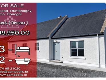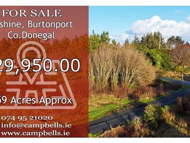 Situated in the popular scenic townland of Belcruit, just a few minutes drive from the nearby villages of Burtonport & Kincasslagh, Campbells are delighted to present this parcel of land for sale to the open market. Situated along the Dungloe - Kincasslagh Road in close proximity to Keadue Strand, this property extends to approximately 1.1 Acres and benefits having Full Planning Permission (Planning Ref: DL21/52471) for a four bedroom property extending to approx. 2,200 sq. ft. in which Sect. 47 applies. In addition to having F.P.P. the property also benefits from ample road frontage as well as beautiful countryside views towards the Keadue Strand while also being just a few minutes drive from Burtonport, Kincasslagh and Dungloe Town. All enquiries and further information from Campbells.ie Our Ref: K1179