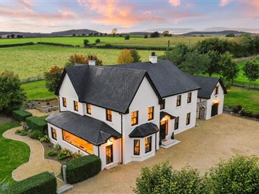 Glendaars House is an extremely pleasant early 20th-century country house, which benefits from significant upgrading and extending in recent years to present a comfortable 5-bedroom home with a separate 1-bedroom annexe apartment. 5269 square feet or 490 square metres. Set within circa 4.6-acres (1.86-hectares) of grounds, the gardens are tremendous and with mature trees, shrubs and hedging are extremely private and tranquil. In addition to the original stables there is a well laid-out barn stabling complex with a turn-out area, a post-and-railed arena, paddock grazing and the benefit of access from a second entrance. The Dublin mountains framing the view below the grazing paddocks. Enjoying a rich and interesting historic provenance Glendaars House dates to circa 1924, when it was first inhabited by Colonel James (Jim) Slattery who was one of Michael Collin's close confidantes in the Free State Army. One of the 'Twelve Apostles' his alias was 'The One-Handed Assassin', a hand being lost in military action. Later, Glendaars House was home to Ann Smurfit, who added the drawing room and family room. More recently, circa 2006, Glendaars House benefited from significant upgrading and extension works that remodelled the accommodation layout to provide four-bedroom suites, ample natural light and modern comfort. The guest apartment is independently accessed and has a large open plan kitchen with dining and living spaces, a bedroom and shower room. Adjacent is a large 2 door garage. A majestic laurel arch entrance with electric security gates leads to a gravelled forecourt in front of the house. A generous reception hall has a chequered tiled floor and cast iron fireplace with an open fire. The family room is dual aspect and has a distinctive exposed beam ceiling, large timber fireplace with an open fire and a large south-west facing bay window. It leads into the study, again dual aspect and with a large bay window, open fireplace, double French doors to outside and linking to the kitchen. The dining room has timber fireplace with an open fire and links to a large games or party room. Spacious it enjoys a triple aspect with large double French doors to a garden terrace, an open fireplace, exposed beamed ceiling and three bay windows. It is an extremely versatile space. The kitchen also enjoys a triple aspect and is a generous open plan living space with kitchen, living and dining spaces. It too has exposed ceiling beams, a fireplace with a wood stove and large double French doors to a garden patio terrace. Upstairs there is a wonderful master bedroom suite, four further bedrooms suites, a fifth bedroom and a family bathroom. The master suite has a large dual aspect bedroom, an ensuite bathroom with fitted bath and separate shower and a generous walk-in closet and eaves store. The second bedroom suite has an open fireplace, a dressing room and ensuite shower room, while bedrooms suites three and four each have ensuite shower rooms. The fifth bedroom is nearby to the family bathroom, itself positioned just off the stair landing. The gardens are extremely pleasant with well-placed south and west facing patio terraces linking easily to the house. A children's play area within a stand of grand old cedar trees is magical and well sheltered. Mature shrubs and trees throughout the gardens ensure rich seasonal colour and include a distinctive red maple tree, oak, chestnut, sycamore, roan, silver birch, cherry blossoms, weeping willow trees and an apple orchard. Mature hedges ensure great shelter and privacy. Box hedging frames manicured lawns. The location is highly desirable, easily commutable to Dublin city and its international airport (a circa 35-minute drive), yet remarkably extremely tranquil and quiet. Naas town and Sallins (train station) are less than a 10-minute drive, the K-Club just a 5-minute drive and Maynooth town Quintessential country living, yet easy access to bustling urban centres.