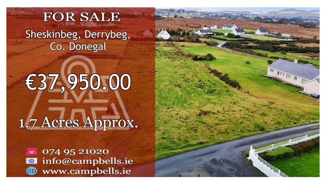 Site for Sale Campbells Auctioneers Are Delighted To Present This Attractive Site Situated In Sheskinbeg, Just A Short Drive From Derrybeg Village Extending To Approximately 1.7 Acres The Property Benefits From Ample Road Frontage And Presents Excellent Potential For The Construction Of A Dwelling, Subject To The Purchaser Obtaining The Necessary Planning Permission. For Further Information, Please Contact Campbells Auctioneers. Our Ref: K1160